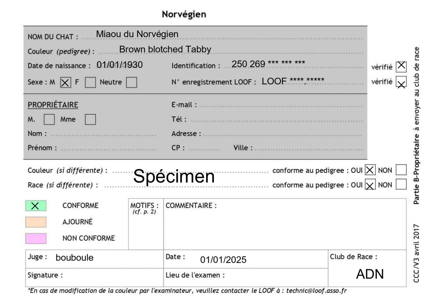 - La partie B du formulaire de l'examen de conformité en renseignant dans le cadre en bas à droit le club de race ADN.